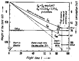 This value is distinctly more than the available 70 grams! The bird may not go below the limit of 130 g (Fig. 1). In spite of flying at the speed which minimizes his fuel consumption, the bird has not enough fuel to reach Hawaii. To find the number of hours that the fuel is sufficient for, we find using GZ = G0 (1 - p)Z = 200 - 70 = 130 g that the 70 g of fat are used up after Z = 72 hours, which means that after 81% of the projected time (i.e. a good 800 km before the end) the bird crashes into the sea. Have we miscalculated, or has the Creator not, as we thought, designed and equipped the bird properly? Neither: the Creator's work leaves us amazed. The clue is the motto: "optimal use of energy through information." He gave the bird an important piece of information as well: "Do not fly singly (curve GE) but in V-formation (curve GK). In V-formation you will save 23% of your energy and reach your winter quarters safely." Fig. 1 also shows the curve GK, the rate of weight loss when flying in V-formation. After 88 hours this would normally leave 6.8 g of fat in hand. This remaining fuel reserve is not superfluous, however, but has been included by the Creator so that the bird reaches its goal even with a contrary wind. The extremely low fuel consumption of p = 0.6% of the total weight per hour is even more astonishing when one considers that the corresponding values for man-made mechanical flying machines are many times larger (helicopter p = 4 to 5%, jet p = 12%). For anyone who does not regard these finely adjusted processes as the work of a Creator, the following questions remain unanswered: